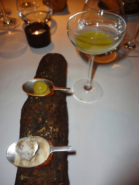 Azeitona preta revestida por um polme de tempura leve e estaladiço; Azeitona verde explosiva, ou seja, uma esferificação de sumo de azeitona que rebenta na boca; Dry martini invertido, ou seja, uma esferificação com gin no interior