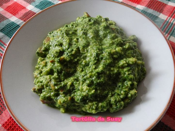 Para acompanhamento, coloque o esparregado, o dente de alho e o azeite numa frigideira. Adicione a broa esfarelada e misture muito bem.