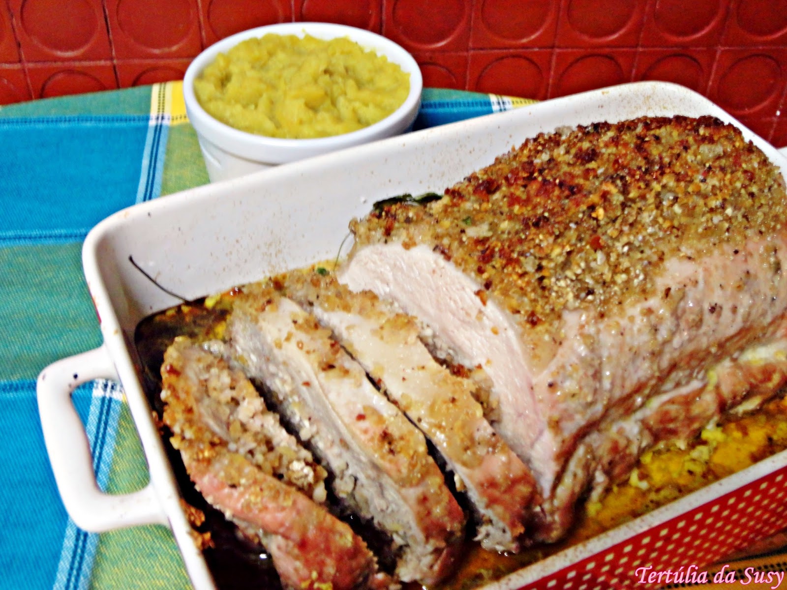 Lombo de porco recheado com castanhas e puré de batata-doce