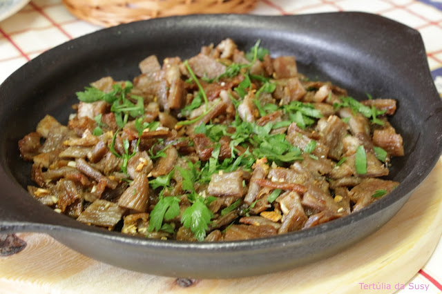 Leve a frigideira com os alhos picados ao lume e deixe-os começar alourar. Adicione os secretos, cortados em bocados, não muito grandes e os coentros. Envolva tudo e sirva.